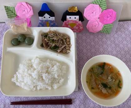 春を感じる献立の一つである、「きな粉よもぎだんご」が登場しました。よもぎの風味ときな粉がよく合う、おいしいデザートでした。