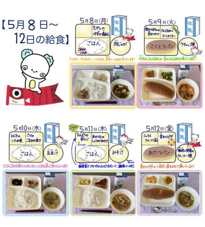 今週は、春が旬である「えんどう」が登場しました。13キログラムのえんどうを、給食室でさやから取り出して調理しました。また、児童に人気のある、ぎょうざの皮をピザ生地に見立てた「変わりピザ」も登場し、「もっと食べたかった!」とうれしい声がたくさん聞こえました。
