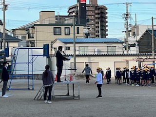 全校朝会で 校長先生から児童が描いた絵画作品の表彰がありました