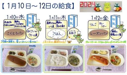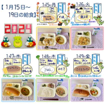 3学期の給食が始まっています。1月15日は正月の行事献立として、雑煮、ごまめが登場しました。1月にはほかにも、黒豆、くりきんとん、紅白なますの正月らしい献立が登場します。