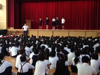 この写真は、昨日の児童集会で、修学旅行前の報告を、全校児童に行っているところです。