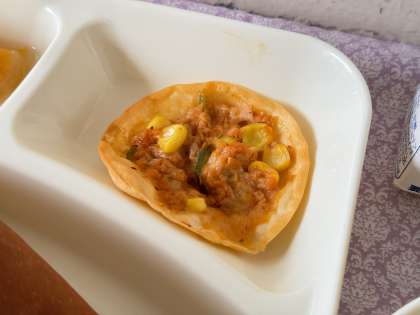 5月1日に登場した「変わりピザ」は、ぎょうざの皮にツナ、コーン、ピーマン、ピザソース、チーズを混ぜ合わせた具をのせ、焼き物機という機械で蒸し焼きにして作っています。ひとり1枚の変わりピザなので、もっと食べたかった!!とうれしい声が聞こえてきました。