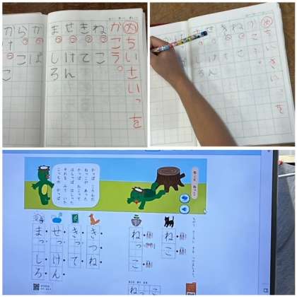 『ちいさい「っ」をかこう』というめあてで、ちいさい「っ」をどこに入れればいいのか考えながらノートに書いていました。