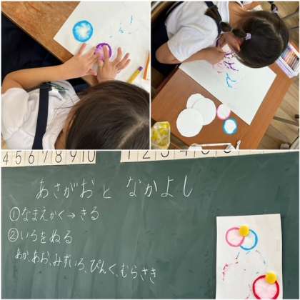 「あさがおとなかよし」で、パスを使ってあさがおの花を描いていました。