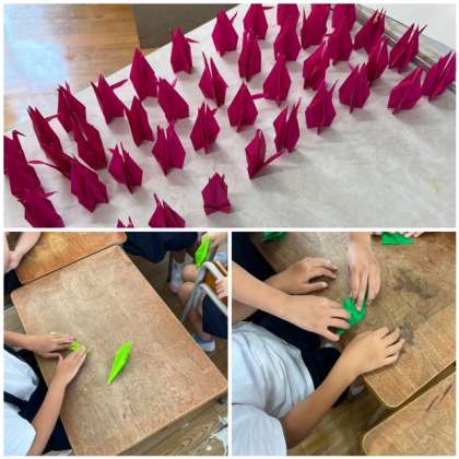 2時間目は折り鶴をおります。6年生は1年生に折り方を教えていました。