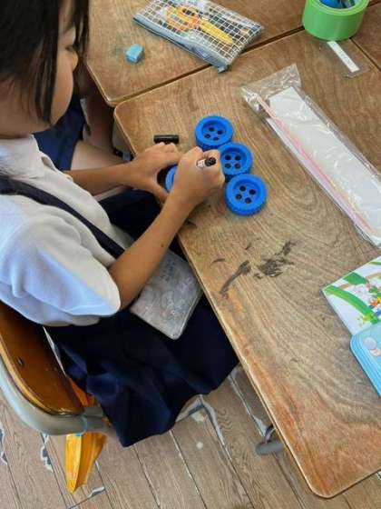 先生から、「タイヤ」を配られて、テンションがあがります。何を作ろうかな?