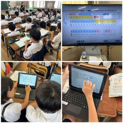 「言葉でアンサンブル」の学習はタブレットを使って、ちょっとした「作曲」です。