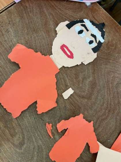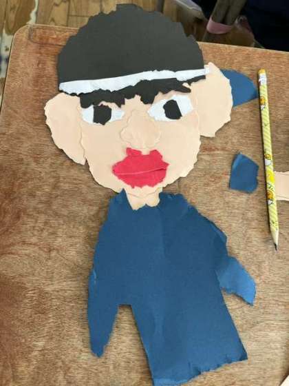 2年生の教室では、「ももたろう」を題材に、色画用紙をちぎって作品を作っていました。