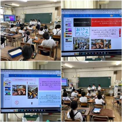 3年生の教室から、発表の声が聞こえてきます。教室では、昨日作っていた資料を使って、発表をしています。