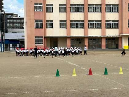 今日の3時間目は2年生が体育館で、1年生が運動場で運動会の練習をしていました。