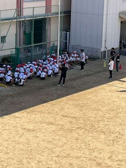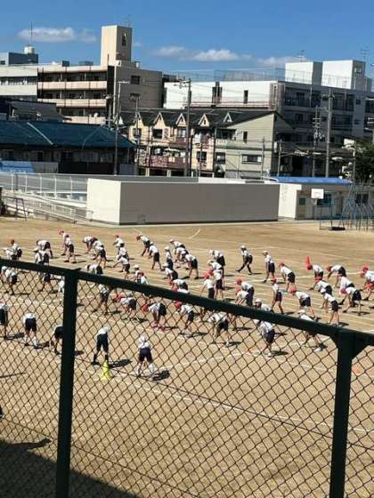 4時間目の運動場では、5年生が運動会の練習をしています。