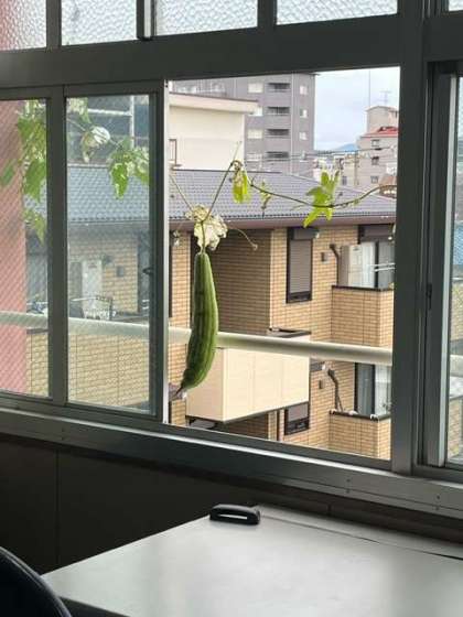 学習園からのびたヘチマが3階までのびて、実をつけています。