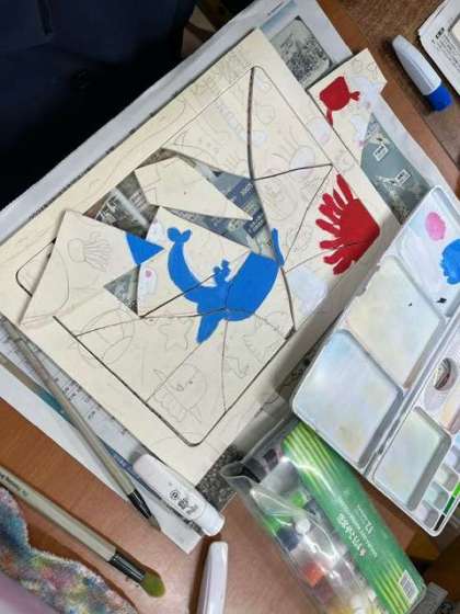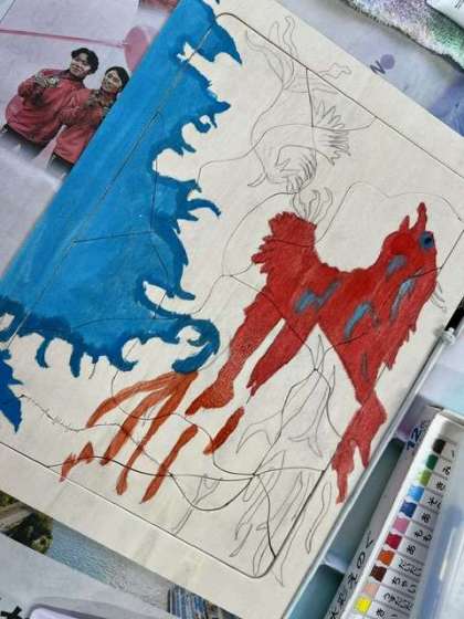 5年生の教室をのぞくと、先日電動ノコギリでカットしていた作品に色をつけています。