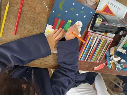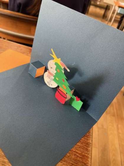 3年生の教室をのぞくと、クリスマスカードを作っていました。