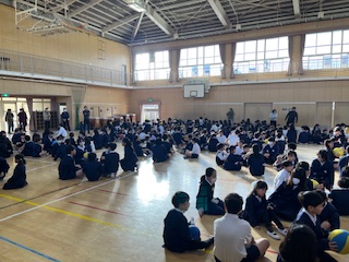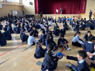 音楽がなっている間、ボールを回します。音が止まった時にボールを持っている人がアウトです。