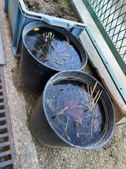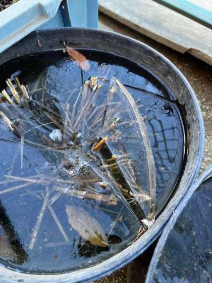 今朝、職員室の前に置いてある「バケツ稲」の田んぼの水が凍っていました!
