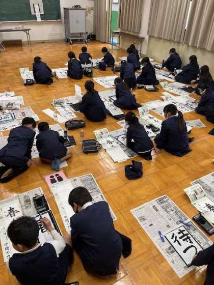 いつもの半紙で練習してから、書き初め用の半紙で清書します。