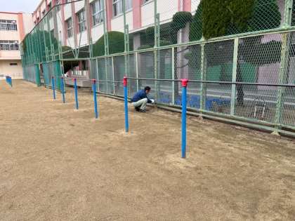 運動場で管理作業員さんが何やら作業中。