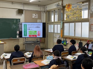 各学級では、「いじめ防止教室」を視聴し、考えたり、学年ごとに設定した教材を使って仲間づくりについて考えました。