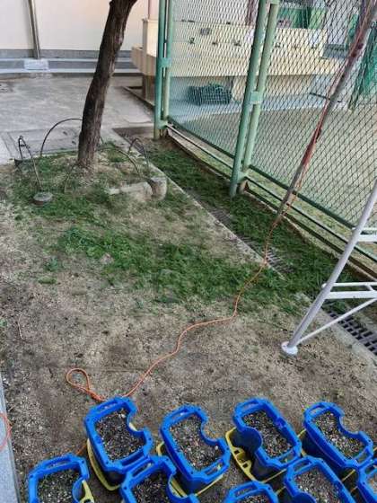 管理作業員さんが脚立に登っています。