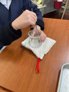 今日は「水にとけるものの量」について、『決まった量の水にとけるものの量には限りがあるのだろうか』という問題について実験していました。