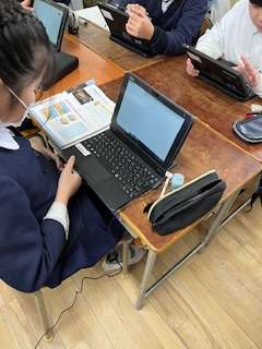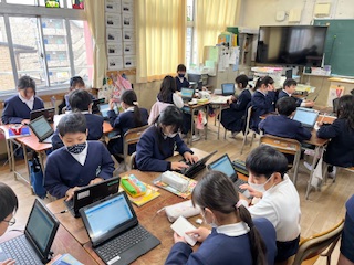 タブレットを使って地震などの自然災害について調べ、まとめる学習をしています。