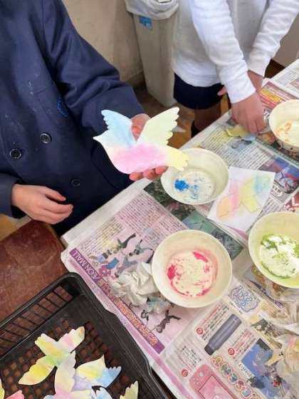 完成した人は学年で作る掲示物に取り組んでいました(写真右)