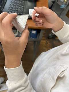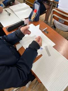 「立体をくわしく調べよう」の学習で、三角柱の展開図をかいて組み立てていました。