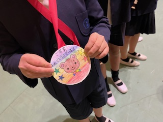 ^_^{1年生が首にかけやすいようにしゃがんでいる6年生…。やっぱり優しい