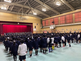 学年ごとに並びかえたら、「お祝いのセレモニー」です。在校生から、呼びかけと歌を送りました。