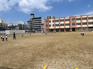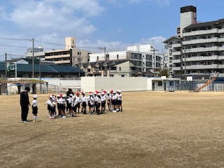 先生の笛の合図でいったんバラバラに散らばった後(写真左)、笛の合図で四列に整列していました(写真右)。