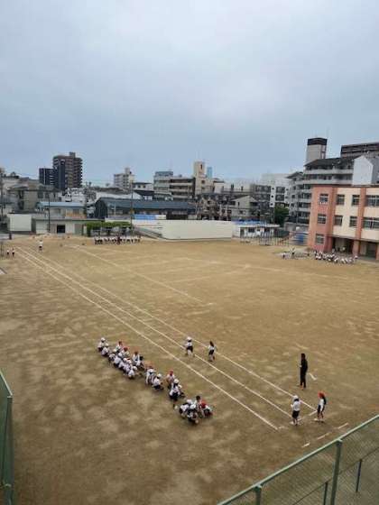 学年合同で、新体力測定のリハーサルをしていました。