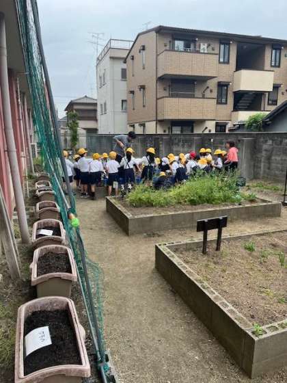 植木鉢を片手に、学習園に集まった2年生。