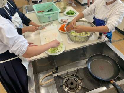 野菜を切ったりちぎったりして、ボリュームたっぷりの野菜を炒めています。
