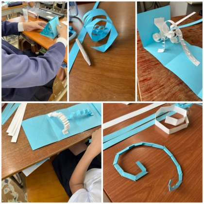 画用紙を切ったり折ったり筒のように丸めたりしながら、立体作品を作っていました。