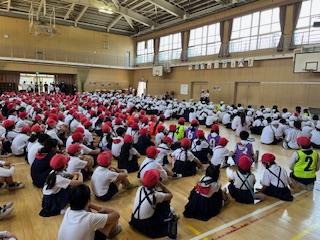 講堂へ向かう途中も「あれがおもしろかった」「あそこでたくさん点数がとれた」と、まだまだ興奮がさめやらない感じでしたが、会が始まると、キチンと代表委員会の人の話を聞いているところが立派でした。
