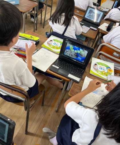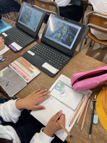 タブレットで撮影して、教室でカードに書きこんでいます。