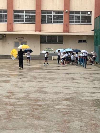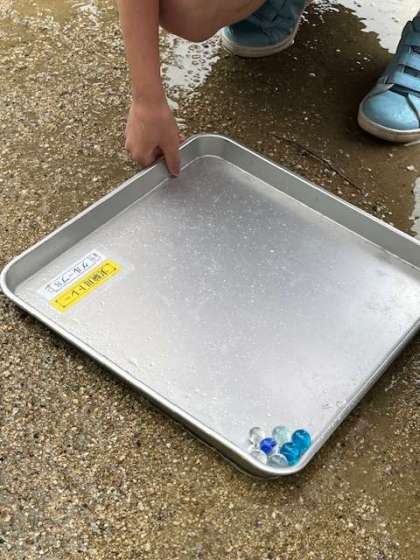 今日は雨なので「水の流れと地面のかたむき」の観察に最適!…と、運動場で活動していました。