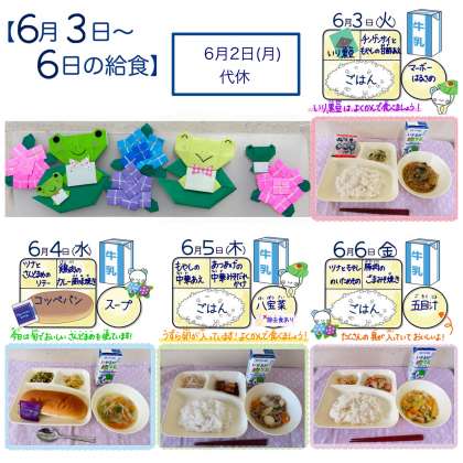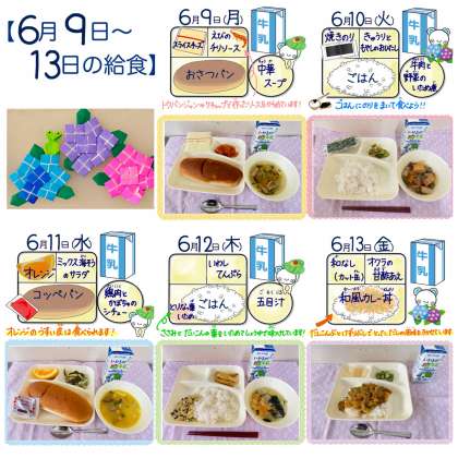 6月から9月が旬である「さんどまめ」を使った献立がありました。歯ごたえがあり、おいしくいただくことができました。13日の「和風カレー丼」はいつも好評で、どのクラスも食缶が空っぽになって返ってきました。