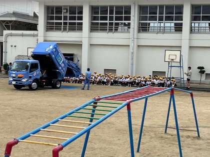 環境事業局の方をゲストティーチャーに招いて、パッカー車の仕組みを学習しました。