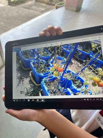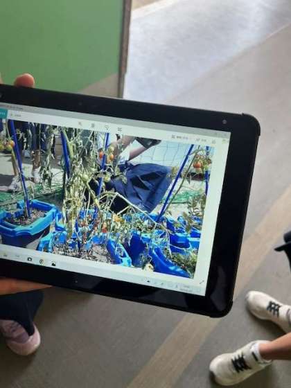 タブレットを手に写真を撮り、水をあげ、赤い実があれば収穫していました。