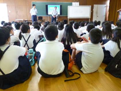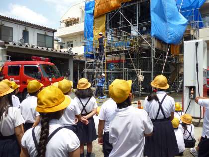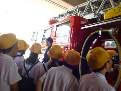 4年生は、5月31日(火)に、平野消防署へ社会見学に行きました。最初に消防署の仕組みについてのお話を聞きました。次に、消防車、はしご車、レスキュー隊が使う道具を見せてもらいました。そして、消防訓練の様子を見学させてもらいました。最後に質問コーナーがあり、子どもたちから出たたくさんの質問に、丁寧に答えていただきました。