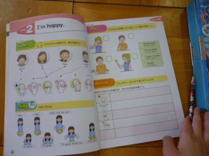 本日は、「How are you?」(ご機嫌いかがですか。)と聞かれて自分の思いを伝える単元を学習しました。さて、今の気持ちは…「I'm fine/happy/hungry/sleepy.」。
