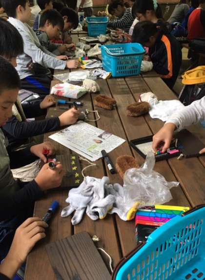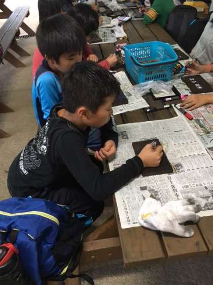 ポスターカラーを使って、焼板に絵や文字をかきます。