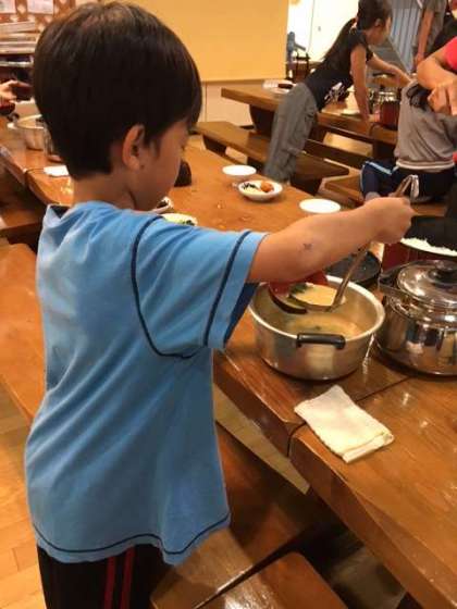 7時30分から朝食です。食事係の子たちは10分前に集まり、班のメンバーのために準備をします。
