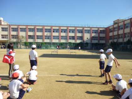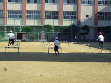 12月3日(火)、5年生体育科のハードル走です。陸上運動として、ハードルをリズミカルに走り越えることをめあてに取り組んでいます。