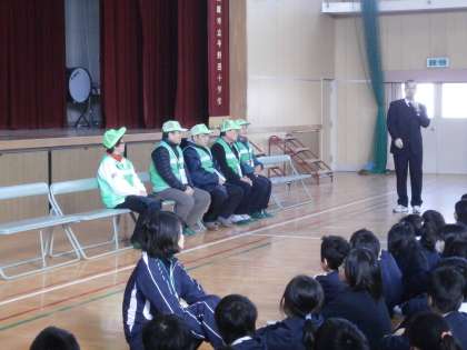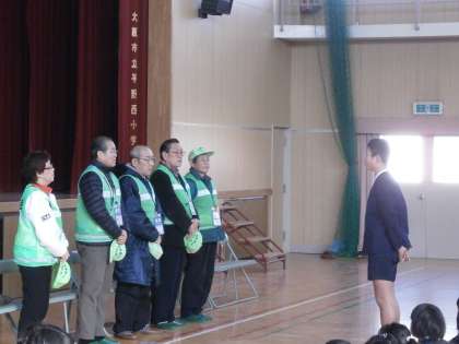 朝の全校朝会を活用し、いつも子どもたちの登下校を見守っていただいている見守り隊の皆さんへ、お礼の会を開催しました。