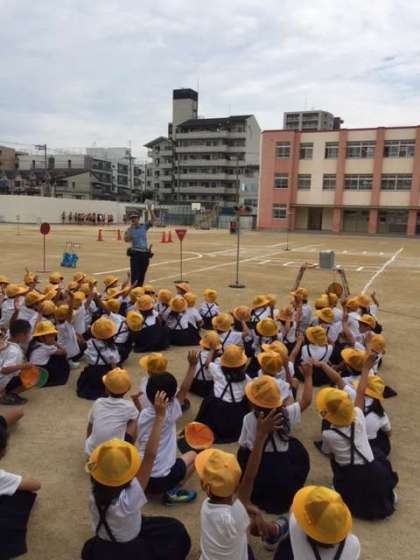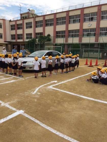 7月18日(火)の2時間目、平野警察署交通課の方が来校し、1年生へ交通安全指導を行いました。まず、信号機等の交通ルールについての話を聞き、その後、車を運転する人が見えない場所の確認、歩行の実技練習を行いました。