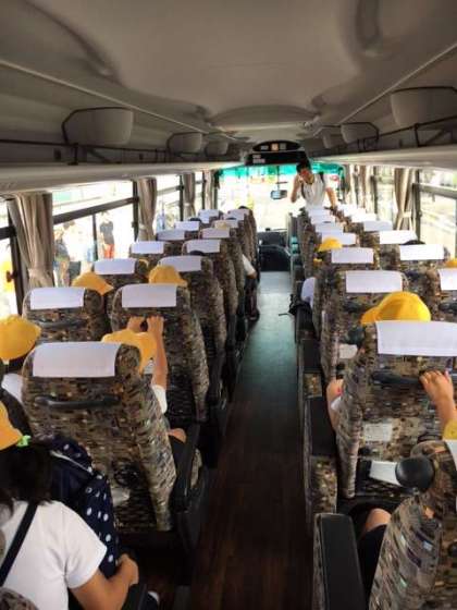 子どもたちによるバスレクが始まり、クイズをしたり、ゲームをしたりして、盛りあがっています。