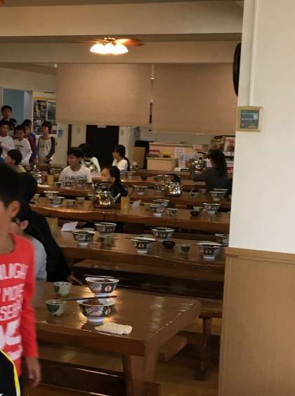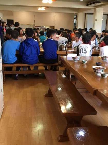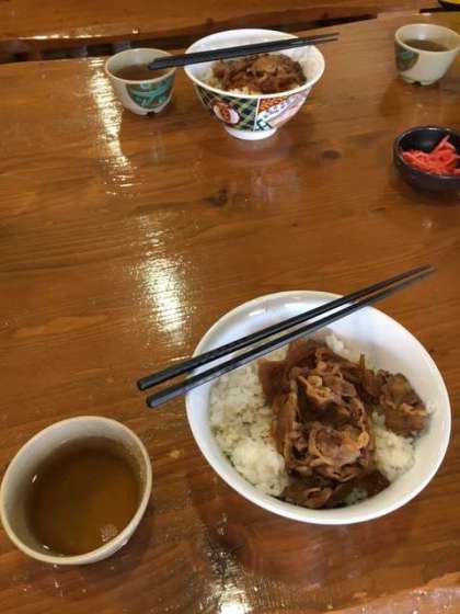 宿舎でお昼ご飯をいただきました。メニューは牛丼です。とても美味しくて、おかわりする子もいました。